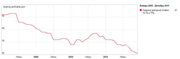 Что касается прошлого 2011 года – цены на аренду торговых площадей резко падали от 32€ в начале года до 21€ в конце (снижение цен на 34%), это можно просмотреть на графике ниже, где представлены средние ставки арендной платы за торговые помещения в торговых и торгово-развлекательных центрах г. Минска. Ставки указаны в евро за квадратный метр арендуемой площади в месяц с НДС, но без учета коммунальных и эксплуатационных расходов.